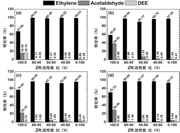 因此,提到在包含高達(dá)50wt%的活性炭的雙載體體系中發(fā)現(xiàn)的乙烯回收率的提高是由于來自活性炭的碳原子對催化劑的電子作用。另外,由于通過焦化的失活,大量的活性炭將導(dǎo)致乙烯回收率的降低,這是在高溫下與含碳反應(yīng)物的反應(yīng)中發(fā)現(xiàn)的常見的失活方案。這種失活導(dǎo)致活性位點的阻塞,降低了活性位點的數(shù)量,導(dǎo)致催化劑的總轉(zhuǎn)化率降低。