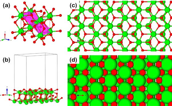 圖3:氧化鋯呈四方形結(jié)構(gòu),具有(a)高亮表面,(b)真空度為10Å的平板模型,球棒表面的俯視圖,(c)和空間填充視圖,(d)綠色和紅色原子分別是Zr和O。