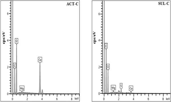 各種尺寸的活性炭和磺化炭的SEM圖像形態(tài)如圖1所示。。ACT-C和SUL-C催化劑的SEM圖像表明,白點(diǎn)代表無(wú)機(jī)成分。從圖像可以看出,活性炭具有不規(guī)則的致密結(jié)構(gòu),而顆?雌饋(lái)像具有光滑表面的顆粒。圖2顯示了ACT-C和SUL-C催化劑的EDX圖,并觀察到SUL-C圖中存在硫。此外,在ACT-C和SUL-C的圖中,還有一些額外的峰涉及雜質(zhì),因?yàn)樘荚词菑U物生物質(zhì),因此可能存在這些雜質(zhì)。如圖3所示,通過(guò)TEM分析了活性炭和磺化炭的形態(tài)和結(jié)構(gòu)。該TEM圖像ACT-C催化劑的“A”表示僅存在微孔,而SULC催化劑則顯示了“微孔”和“中孔”,這是由于活性炭材料上的磺化作用所致,在活性炭材料中產(chǎn)生了中孔。