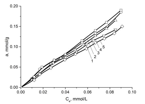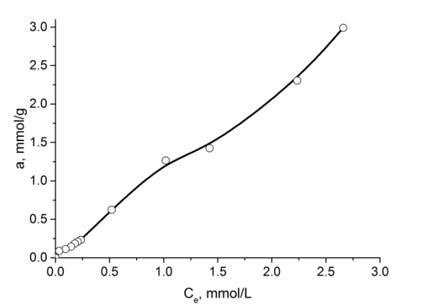 鍶離子的吸附平衡常數(shù)得出吸附平衡常數(shù)等于2,并且ΔG0值分別為0.5 kJ / mol。根據(jù)以前的數(shù)據(jù),活性炭吸附劑-H2O的水界面ΔG0等于2.3 kJ / mol。具有比溶劑(水)低的標(biāo)準(zhǔn)摩爾吸附微分自由能(ΔG0)的吸附劑無法將其從吸附劑表面(從其孔隙)中置換出來,但是鍶離子在相對(duì)較高的平衡濃度下被吸附,其值這些離子的吸附量相當(dāng)大(圖1)。這種現(xiàn)象可以通過以下事實(shí)來解釋:在低平衡濃度下,鍶離子與活性炭的多孔結(jié)構(gòu)中的水分子相互作用,從而形成Sr(OH)+離子;钚蕴课⒖捉Y(jié)構(gòu)中Sr(OH)+的形成和擴(kuò)散過程已有實(shí)驗(yàn)。在相對(duì)較高的平衡濃度下,水分子不會(huì)因與羧基(-COOH)以及與磷酸鹽和多磷酸鹽基團(tuán)(P = O,COP)相互作用而與活性炭結(jié)合的鍶離子置換。
