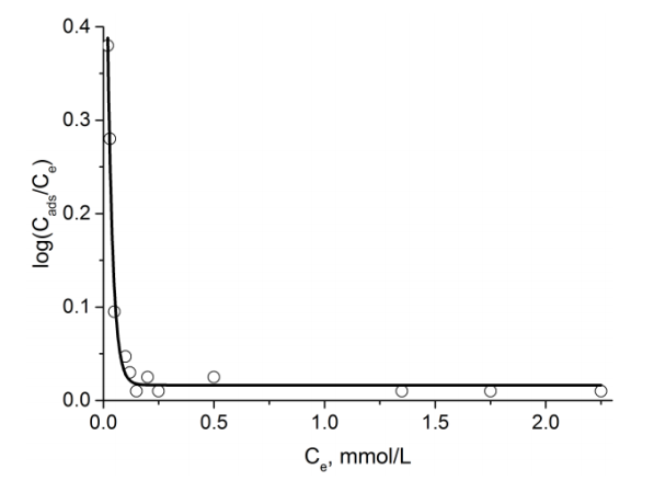 圖1顯示了活性炭上鍶離子從水溶液中的吸附等溫線。如圖1所示,即使在較高的平衡濃度下,所顯示的等溫線也具有拐點(diǎn)。坐標(biāo)中鍶離子的吸附等溫線如圖2所示。通過外推曲線,以圖形方式獲得logKads值;钚蕴康慕Y(jié)構(gòu)參數(shù)由Dubinin–Radushkevich方程根據(jù)苯吸附-解吸等溫線確定。