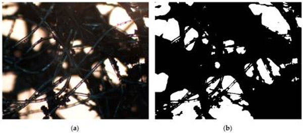 活性炭介質(zhì)250倍放大的顯微照片,然后用數(shù)值計算出與圖像其余部分相比具有較暗陰影的區(qū)域的面積(被活性炭介質(zhì)覆蓋的區(qū)域)。首先,我們使用常規(guī)的多通道和彩色圖像轉(zhuǎn)換為灰度圖像,然后生成圖像,其中每個像素的值均為0(白色像素)或1(黑色像素)(圖1)。接下來,我們應(yīng)用例程,對于給定的灰度圖像,該例程確定由黑色像素簇覆蓋的整個灰度圖像的比例。這種方法使我們能夠粗略評估活性炭復(fù)合材料中活性炭附聚的均勻性,而無需考慮基礎(chǔ)非織造布的不均勻性,因為例程省略了透明PET纖維。