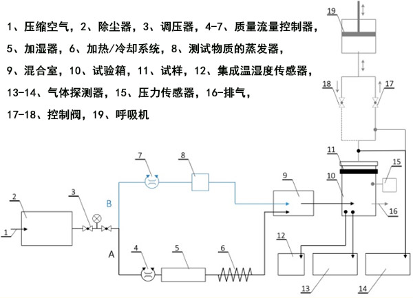 在測試過程中,干燥的壓縮空氣通過裝有減壓器的顆粒過濾器輸送到系統(tǒng)中,該壓力過濾器的調(diào)節(jié)范圍為0-8 bar。然后將其分為兩條線(圖2):用于溫度和相對濕度調(diào)節(jié)的線A和用于調(diào)節(jié)測試室內(nèi)測試物質(zhì)濃度的線B。將來自管線A的給定溫度和相對濕度的空氣與來自管線B的激發(fā)蒸汽在混合室中混合,然后將活性炭鎖定在直徑為11.3的氣動樣品架中,并將其引入測試室。另外,在脈動流測試期間使用了連接到測試室出口的呼吸機。呼吸機設(shè)定為25個循環(huán)/分鐘和2 L/沖程,這對應(yīng)于每分鐘25吸氣和25呼氣,呼吸量為2L。呼吸機的氣流模式為正弦曲線。脈動流量測試期間的挑戰(zhàn)濃度得到補償,以確保將總負載標準化為穩(wěn)態(tài)流量條件。實驗以四個變體進行,每個變體評估不同因素(即挑戰(zhàn)濃度,相對濕度,挑戰(zhàn)流速,挑戰(zhàn)流型)對活性炭復(fù)合材料吸附特性的影響。