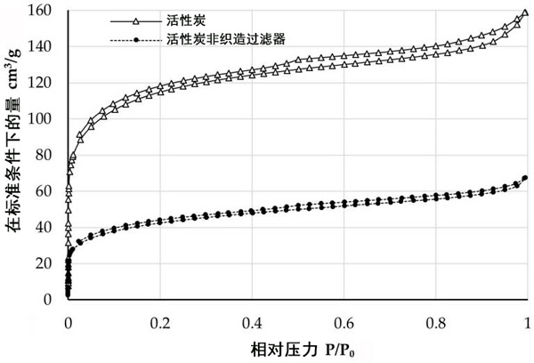 活性炭和負載活性炭的非織造過濾器的氮吸附(下部分支)/脫附(上部分支)等溫線如圖3所示。