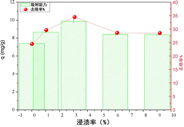 為了評估各種浸漬率對改性活性炭的磷酸鹽吸附能力的影響,在不同的納米銀顆粒/活性炭質(zhì)量比(1%,3.0%,6.0%和9.0%)下,以原始活性炭和負載納米銀顆粒的活性炭進行了初步實驗。 。在這項研究中,實驗是在25±2°C的溫度下,初始磷酸鹽濃度為30 mg/L,吸附時間為60分鐘,吸附劑量為1.2 g / L進行的。