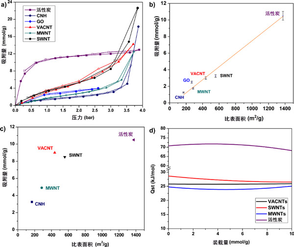 圖1顯示了不同吸附劑的示意圖。活性炭具有無序的孔結(jié)構(gòu)(圖1a),其孔隙度是由基本結(jié)構(gòu)單元的無規(guī)堆積引起的,該結(jié)構(gòu)單元可能是小于10-20環(huán)的平面芳族結(jié)構(gòu),分布在2-4層上或有缺陷的微石墨烯層。具有這種形態(tài),它代表具有擴展的結(jié)構(gòu)紊亂的類型學(xué)碳吸附劑。氧化石墨烯具有2D分層結(jié)構(gòu),如圖1b所示。合成氧化石墨烯的起始材料是石墨,石墨的氧化引入了氧官能團,繼而增加了層間距并使材料變成親水性。隨后的剝落步驟將各層分開,從而顯著增加其可訪問的表面積,從而導(dǎo)致單層或少層氧化石墨烯的形成。在我們以前的工作中,通過XPS分析,我們發(fā)現(xiàn)氧化石墨烯上存在的氧官能團是羥基和羧基的形式。材料在孔隙率和功能化程度方面的可調(diào)性使氧化石墨烯成為親水性碳吸附劑的原型,因此對于研究2D材料中的氣體吸附也很有趣。碳納米角具有管狀結(jié)構(gòu),在一端具有封閉的錐形尖端結(jié)構(gòu)(圖1c)。單個碳納米角通常為單壁,內(nèi)徑為2-4 nm。碳納米角的獨特特征是直徑為50–100 nm的剛性球形聚集結(jié)構(gòu)。合成后的碳納米角關(guān)閉,氣體分子無法進入碳納米角內(nèi)部。氧化處理,例如在空氣中加熱,O 2 或CO 2用于打開碳納米角,從而將可及表面積增加3-4倍。碳納米角具有微孔的組合,對于氣體吸附應(yīng)用很有趣,因為它們可以大量生產(chǎn)且純度高。
