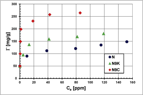 在圖3中比較了初始濃度為100 ppm的活性炭,N9K和N9C表面上初始濃度為100 ppm的聚合物溶液中PAA(Γ)的吸附量。。可以看出,對于所有檢查的活性炭,觀察到隨著pH升高聚合物吸附明顯減少。這是由于所檢查系統(tǒng)中的靜電條件從有利的吸引條件(在較低的pH值)變?yōu)椴焕呐懦鈼l件(在較高的pH值)而引起的。而且,在更酸性的環(huán)境中,聚合物鏈的盤繞構(gòu)型使得吸附層的堆積更為緊密(高PAA吸附)。在較高的pH值下,PAA鏈發(fā)展的增加導(dǎo)致表面層中吸附的大分子的構(gòu)型更加延長,其特征是聚合物鏈段的堆積密度顯著降低(PAA吸附低)。
