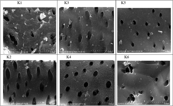 對(duì)原始活性炭(圖3中的K1)的掃描顯示出相當(dāng)均勻的孔;钚蕴康慕Y(jié)構(gòu)可以看作是薄片,為不規(guī)則分布和各種尺寸的孔提供了較大的吸附面積。表面上的大多數(shù)可見(jiàn)孔都在5微米范圍內(nèi),這與對(duì)椰殼活性炭的預(yù)期一致,而在這5微米孔內(nèi)可以看到小于1微米的較小孔。圖3中的K2顯示了在氯酸鹽吸附到表面活性部位后活性炭表面的變化。這些孔有變化的跡象,因?yàn)槠渲幸恍┪铰人猁},而其他孔被氯酸鹽和氯化物分子阻塞。在10,000倍的放大倍率下,可以觀察到小孔周?chē)痛罂兹肟谔幍某练e,因?yàn)轭A(yù)計(jì)表面活性基團(tuán)會(huì)大量存在于這些區(qū)域;钚蕴康乃嵝栽偕鷺O有可能形成了表面活性部位,從而增強(qiáng)了活性炭吸附大量氯酸鹽的能力。