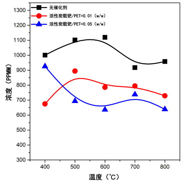 圖2:在有和沒有活性炭載鈀催化劑的條件下,聚對苯二甲酸乙二酯熱解過程中總胺衍生物的濃度隨溫度的變化。