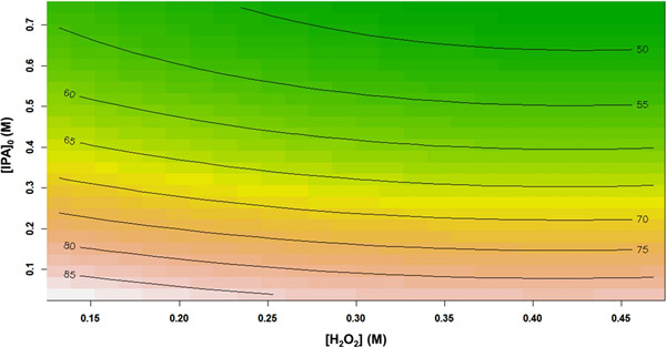 圖2顯示了總有機(jī)碳去除效率百分?jǐn)?shù)與H 2 O 2濃度和初始異丙醇濃度的關(guān)系。從響應(yīng)輪廓中可以看出,將異丙醇初始濃度從0.038 M增加到0.743 M,導(dǎo)致TOC去除率從85.17%急劇降低到46.29%?赡苁且?yàn)樵谙嗤膽?yīng)用反應(yīng)條件下,自由基(OH•)的數(shù)量保持恒定,而初始異丙醇濃度卻增加了。換句話(huà)說(shuō),相對(duì)較少量的氧化基團(tuán)可用于攻擊異丙醇分子。類(lèi)似地,總有機(jī)碳降解性能也隨著H 2 O 2濃度的增加而逐漸降低。過(guò)量的H 2 O 2可能促進(jìn)自動(dòng)清除反應(yīng)的發(fā)生。