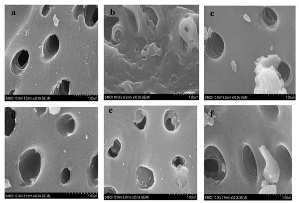 圖2:在0(a),2(b),4(c),6(d),8(e),10(f)循環(huán)數(shù)后經(jīng)過(guò)再生處理的活性炭的SEM圖像。
