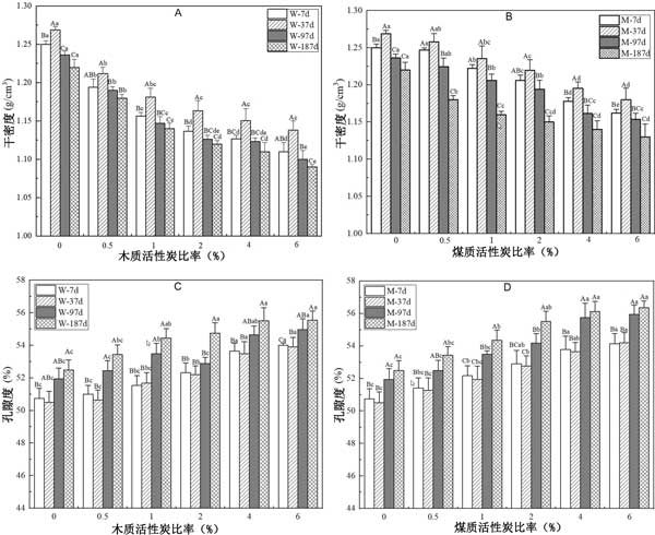圖2:活性炭對植被混凝土干密度(A,B)和孔隙率(C,D)的影響。