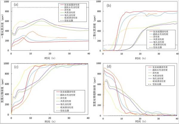 為了測試活性炭在環(huán)境溫度下對氧化和去除的催化和吸附性能。這些簡化的條件與實(shí)際煙氣條件大不相同,后者具有不同的成分和雜質(zhì),并且在不同的壓力和溫度下。但是,這些條件使我們能夠簡化復(fù)雜的系統(tǒng),以更好地了解NO氧化。圖中顯示了在干燥條件下,環(huán)境溫度和壓力下不同活性炭在NO氧化過程中NO,NO 2和氮氧化物的濃度分布圖。NO氧化轉(zhuǎn)化率與運(yùn)行時(shí)間的關(guān)系也可以由NO濃度來計(jì)算的。還計(jì)算了每個(gè)給定時(shí)間的NO入口和氮氧化物出口濃度之間的差異,并顯示為通過吸附去除的氮氧化物量;測試代表在相同條件下通過使用無活性炭催化劑的空反應(yīng)器進(jìn)行的測試。穩(wěn)態(tài)NO轉(zhuǎn)化率,氮氧化物的累積量吸附,以及所需要的時(shí)間,以達(dá)到最大的NO濃度或吸附的突然釋放NO 2的出口流中還從濃度曲線中獲得了這些元素。