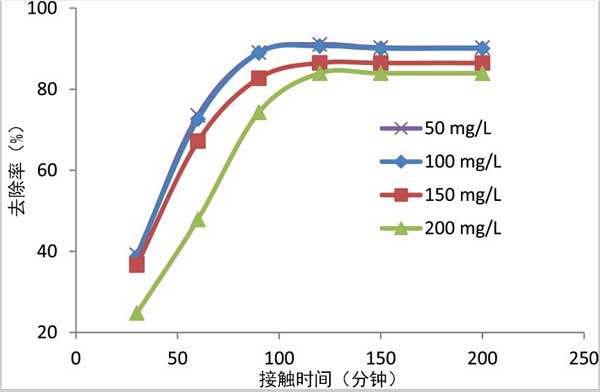 進(jìn)行了兩組實驗以研究苯酚在活性炭負(fù)載納米銀吸附劑上的吸附。進(jìn)行了一組實驗以研究苯酚的初始濃度和接觸時間對活性炭負(fù)載納米銀吸附劑對苯酚吸收的影響。這是通過改變初始濃度(50–200mg/L)和接觸時間(30–200min),同時分別將吸附劑量和攪拌固定在0.2g和200rpm上來實現(xiàn)的。另一組實驗,用來確定活性炭吸附劑的最大程度吸收苯酚的工藝參數(shù)。在這里,選擇的因素包括初始苯酚濃度,接觸時間,吸附劑劑量和攪拌速率等。