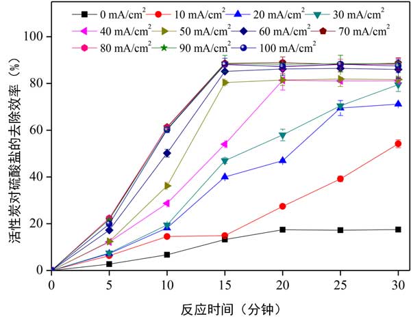 電流密度是一個關鍵參數(shù),它不僅影響凝結劑的用量,還影響氣泡的形成速率,氣泡的大小和絮凝物的生長。各種選定的電流密度:0、10、20、30、40、50、60、70、80、90和100mA/cm2在批量實驗中應用了,以建立電凝與活性炭耦合過程的有利電流密度范圍。在30分鐘的反應時間下使用鋁不銹鋼陽極/陰極電極對進行連續(xù)電凝工藝,并使用反應器中的活性炭濃度為0.2g/L來研究電流密度對硫酸鹽的影響去除效率。與活性炭吸附工藝相比,電凝加活性炭即使在低電流密度(10mA/cm2)時也可以顯著提高去除效率。如圖2所示,活性炭吸附過程和電凝活性炭吸附偶聯(lián)過程的去除效率在5分鐘時分別為2.7%和6.3%,在30分鐘時分別為17.5和54.2%。由于偶合體系中的反應比簡單的活性炭吸附過程更復雜,因此去除效率有所提高。電凝結合活性炭吸附對硫酸鹽去除效率有重要影響。結果表明,去除效率隨著電流密度的增加而顯著提高。電流密度為70mA/cm2時,去除效率最高(88.9%)。這種現(xiàn)象可以歸因于這樣的事實,即在高電流密度下,氧化金屬的數(shù)量增加,從而導致大量的Al(OH)3(s)顆粒有利于去除污染物。
