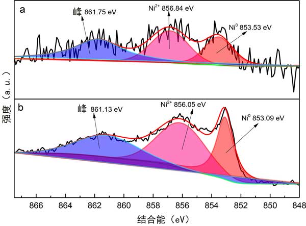 圖2:(a)活性炭載鎳催化劑和(b)活性炭富氮載鎳催化劑的X射線光電子能譜。