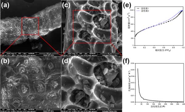 圖1:(a,b)一般活性炭和(c,d)新活性炭的掃描電子顯微鏡圖像和各自的放大倍數(shù);(e)新活性炭的N2吸附-解吸等溫線,(f)由N2等溫線分析得出的孔徑分布。