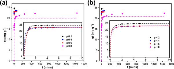圖2:通過非線性(a)偽一階模型和(b)偽二階模型擬合在4、2、4、6和8的四個不同溶液pH下的實驗吸附動力學數(shù)據(jù)。實驗數(shù)據(jù)用點表示,等溫線擬合用虛線表示。