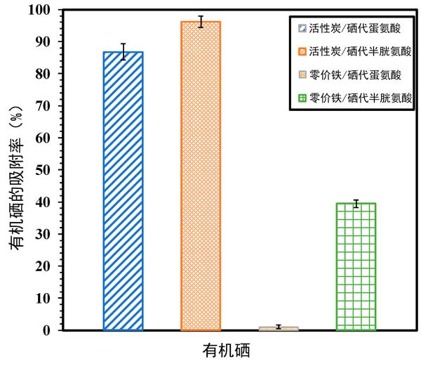 我們進(jìn)行了分批吸附測試,活性炭吸附有機(jī)硒物質(zhì)的分批實驗結(jié)果如圖2所示,活性炭去除有機(jī)硒比nZVI更有效。吸附實驗3小時后,觀察到活性炭從水中去除了96%的硒代半胱氨酸和86.76%的硒代蛋氨酸,而39.44%的硒代半胱氨酸和不到1.05%的硒代蛋氨酸從水相轉(zhuǎn)移到nZVI中。物理吸附和化學(xué)吸附是活性炭吸附的兩個主要機(jī)理。前者是由吸附物和活性炭表面之間形成的相對較弱的范德華力引起的。相反,后者是由吸附物分子與吸附劑表面之間的化學(xué)反應(yīng)驅(qū)動的。