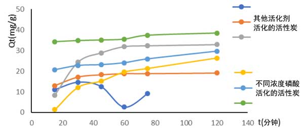 活性炭的吸附時(shí)間影響可從圖1看出,活性炭吸附分三步進(jìn)行:第一是在最初的30分鐘內(nèi),污染物的吸附量很快就被確定了,這可以用在吸附劑的外表面存在大量空置的結(jié)合位點(diǎn),這使得吸附劑易于吸附到該表面。第二在31分鐘后,吸附速率降低,過(guò)程緩慢;钚蕴康钠渌恢眠_(dá)到飽和后,污染物顆粒將遷移到吸附劑內(nèi)部。由于易于接近,因此吸附過(guò)程緩慢:顆粒內(nèi)擴(kuò)散。第三從80分鐘開(kāi)始,我們觀(guān)察到一次接觸,活性炭已達(dá)到其最大容量。我們可以說(shuō)這些吸附劑的平衡時(shí)間是80分鐘。然而,磷酸活化的活性炭吸附量的演化曲線(xiàn)顯示,在最初的30分鐘內(nèi),污染物的吸附量顯著增加,此后,污染物的吸附量急劇下降,這將是一種產(chǎn)物解吸。這一現(xiàn)象在其他吸附劑中是不可見(jiàn)的,這可能意味著可用孔隙的數(shù)量和結(jié)合力隨著所用活化劑濃度的增加而增加,這一點(diǎn)還通過(guò)碘值和亞甲基藍(lán)的值進(jìn)行了驗(yàn)證。
