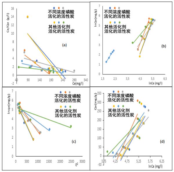 圖3:根據(jù)Langmuir(a),F(xiàn)reundlich,(b)條件D-R-K,(c)和Temkin,(D)苯二胺在活性炭上的吸附等溫線(xiàn)。
