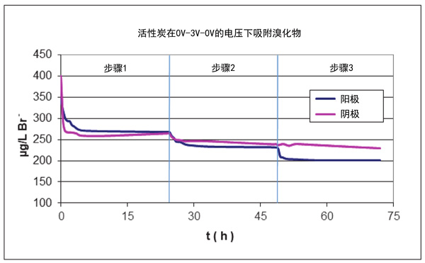 圖4:在三步實(shí)驗(yàn)中的溴化物濃度,第二步對(duì)應(yīng)于在3V下進(jìn)行24h的陽(yáng)極和陰極電吸附實(shí)驗(yàn)。在第二步中施加3V電壓24h,然后將其再次置于開路狀態(tài)24h。
