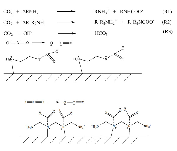 活性炭表面上存在的官能團(tuán)(即胺和羥基)在二氧化碳吸附反應(yīng)中起重要作用。在三亞乙基四胺中,乙二胺的伯胺(RNH2)與二氧化碳反應(yīng)形成氨基甲酸酯離子,如反應(yīng)(R1)和圖2所示。在MCTETA中,伯胺和仲胺(分別為RNH2和R2NH)與如反應(yīng)(R2)所示,如圖2下部分所示。另一方面,活性炭中的羥基官能團(tuán)可通過(guò)反應(yīng)(R3)與CO2反應(yīng)形成碳酸氫根離子。這解釋了為什么在改性之前,介孔炭和活性炭都已經(jīng)具有二氧化碳的吸附能力。