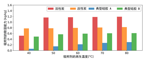活性炭的除濕能力可以定義為在給定溫度和濕度條件下的有效吸附量,其計(jì)算方式為吸附與解吸之間的平衡吸附之差?紤]到實(shí)際環(huán)境條件,相當(dāng)于室外空氣條件的吸附條件為干球溫度為32℃,相對濕度為80%。解吸條件是由再生空氣溫度從40℃到80℃給出的,室外空氣條件下的濕度比為24g/kg。計(jì)算出的除濕能力如圖1所示。比較了活性炭和典型硅膠(A型和B型硅膠)在不同再生溫度下的除濕能力。在硅膠的情況下,由于缺乏數(shù)據(jù),吸附和解吸之間的磁滯被忽略了,并且預(yù)期它很小。