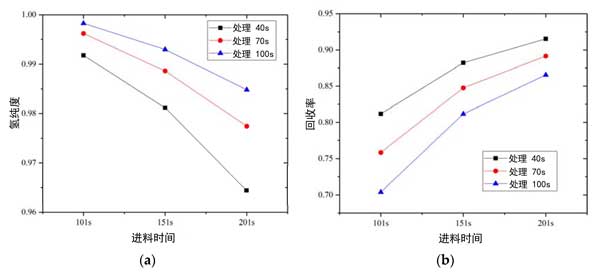 活性炭凈化時間的影響如圖2所示。當(dāng)吹掃時間從40秒增加到70秒時,氫氣純度提高了0.44–1.35%,氫氣回收率降低了2.61–6.57%。當(dāng)吹掃時間從70秒增加到100秒時,氫氣純度提高了0.21-0.76%,氫氣回收率降低了2.91-7.19%。隨著吹掃時間的增加,在吹掃步驟中氫氣的摩爾分?jǐn)?shù)增加,因為更多的不純氣體從吸附劑中解吸出來。因此,隨著吸附劑的循環(huán)利用,這些雜質(zhì)的摩爾分?jǐn)?shù)降低,因此隨著凈化時間的增加,氫純度也隨之提高。但是回收率下降了,當(dāng)進(jìn)料時間短并且吹掃時間增加時,氫純度變化率降低,并且氫回收率變化率增加。